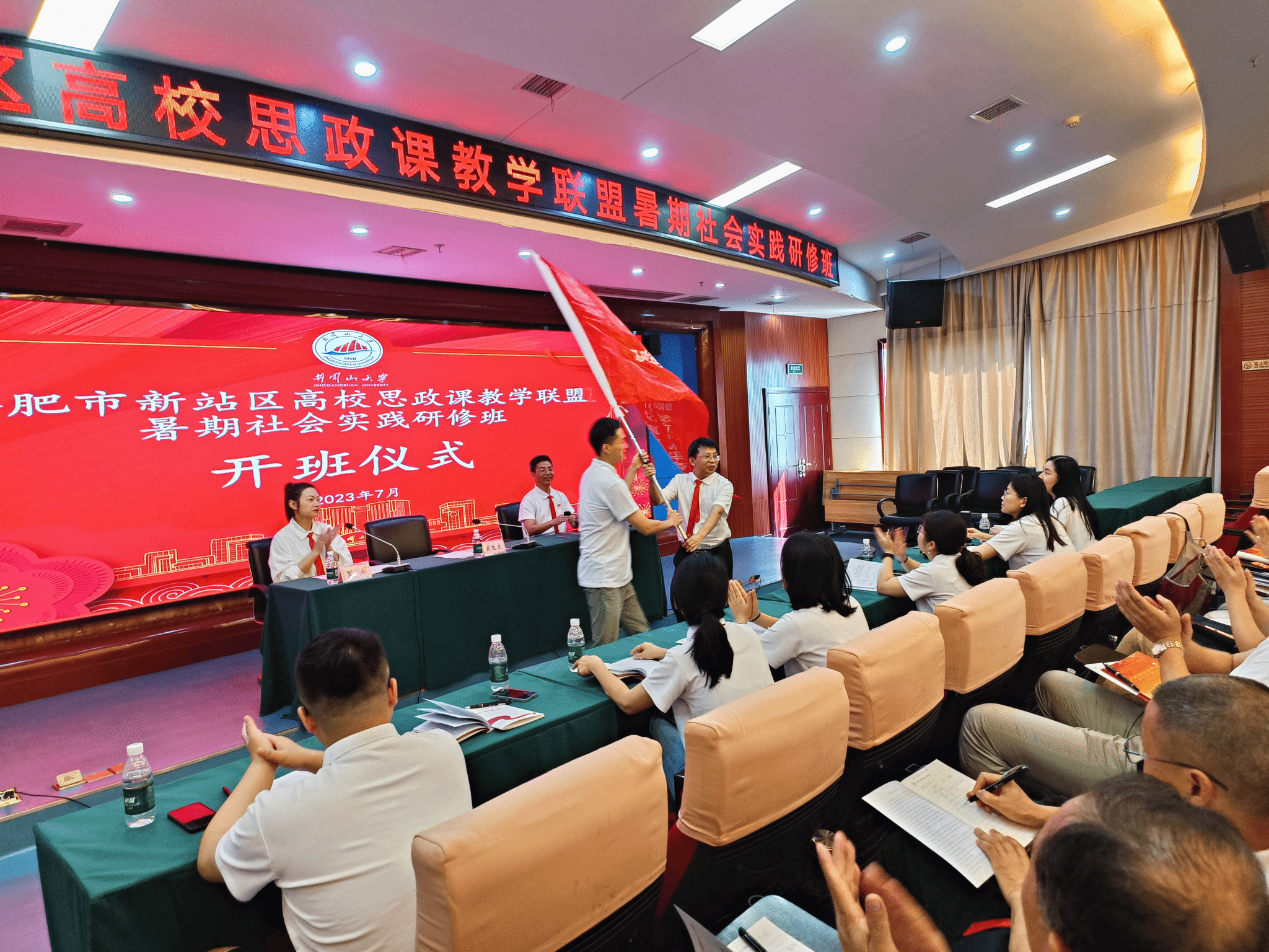 合肥市新站区高校思政课教学联盟暑期社会实践研修班在我校开班 发布时间:2023-07-22 7月21日,合肥市新站区高校思政课教学联盟暑期社会实践研修班在我校开班,井冈山大学马克思主义学院院长肖发生同志致辞并授旗,安徽中医药大学马克思主义学院院长董玉节同志讲话,开班式由井冈山大学继续教育与培训学院培训部贺薇主持,全体学员参加了开班式。本次培训自7月21日开始至7月25日结束,期间在我校开展《红色资源融入高校思政课教学的理论与实践》《井冈山斗争与井冈山精神》专题教学,在井冈山及周边地区开展现场教学与体验教学等。(图文:罗铖 审核:肖贻滨 王志民) 上一条:河北北方学院学习贯彻习近平新时代中国特色社会主义思想主题教育暑期管理人员培训班在我校开班 下一条:广西工业职业技术学院2023年中层及以上管理人员培训班(第一期)顺利开班