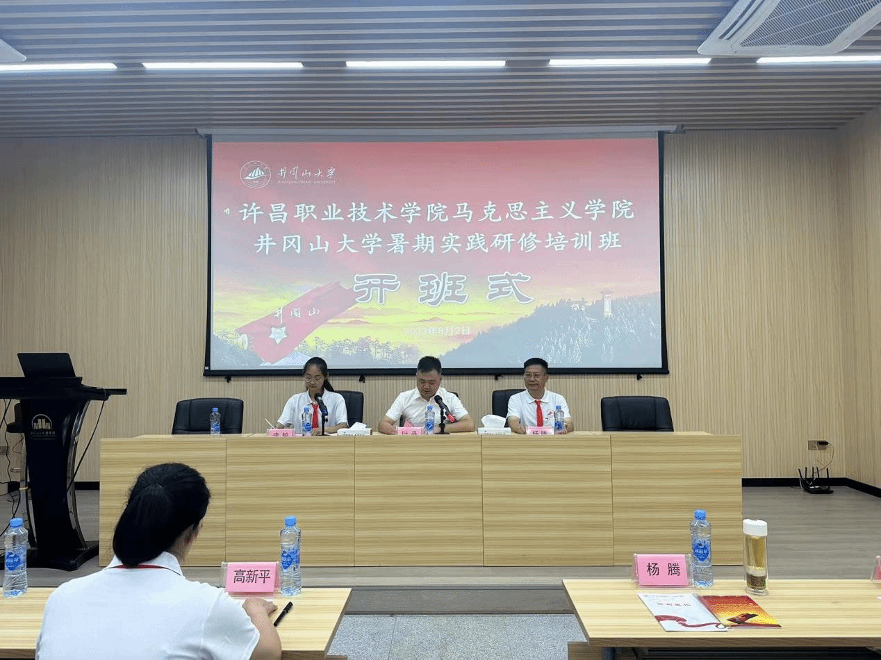 8月2日,许昌职业技术学院井冈山大学暑期实践研修培训班在我校开班,井冈山大学马克思主义学院党委书记叶丹同志为培训班致辞并授旗,许昌职业技术学院马克思主义学院副院长杨腾同志讲话,开班式由井冈山大学继续教育与培训学院带班员李敏主持,全体学员参加了开班式。