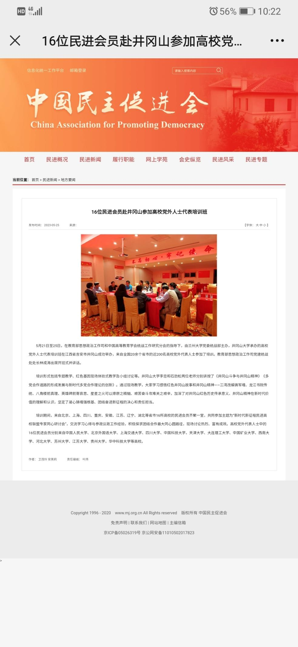 16位民进会员赴井冈山参加高校党外人士代表培训班 发布时间:2023-05-26 (图文:罗铖 审核:肖贻滨 王志民) 上一条:高校党外代表人士培训班在井冈山顺利举办 下一条:高校党外代表人士培训班学员龙明秀学习感悟