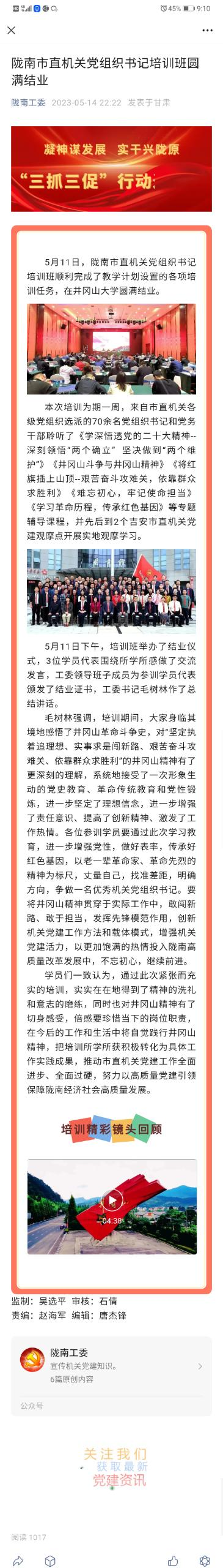 陇南市直机关党组织书记培训班圆满结业 发布时间:2023-05-15 网页链接:(图文:罗铖 审核:肖贻滨 王志民) 上一条:服装设计学院党委组织教师党员赴井冈山开展主题教育红色研学 下一条:陇南市直机关党组织书记培训班在井冈山大学开班