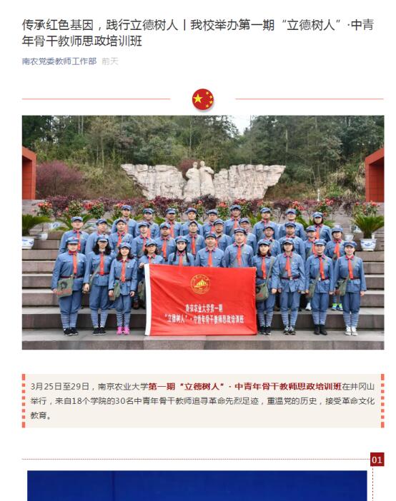 传承红色基因,践行立德树人丨我校举办第一期“立德树人”·中青年骨干教师思政培训班新闻报道 发布时间:2019-04-04 https://mp.weixin.qq.com/s/QUCRXDHEdN3K4XWpbMADdg 上一条:金华教育学院学员诗组三篇 下一条:北京体育大学马克思主义学院“担当新时代使命 传承井冈山精神” 井冈山社会实践活动系列报道
