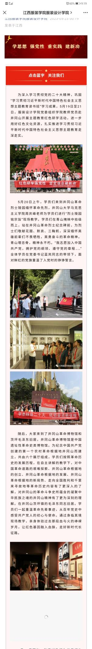 服装设计学院党委组织教师党员赴井冈山开展主题教育红色研学 发布时间:2023-05-25 (图文:罗铖 审核:肖贻滨 王志民) 上一条:高校党外代表人士培训班学员龙明秀学习感悟 下一条:陇南市直机关党组织书记培训班圆满结业