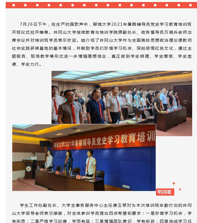 聊城大学2021年暑期辅导员党史学习教育培训纪实日志·第一天 发布时间:2021-07-27 上一条:(转载廊坊师范学院)追寻红色足迹 感悟革命情怀——学校举办2021年暑期党支部书记、组织员培训班 下一条:“卓越·领航”红色大课堂学生党员赴井冈山实践团学习纪实——第一天